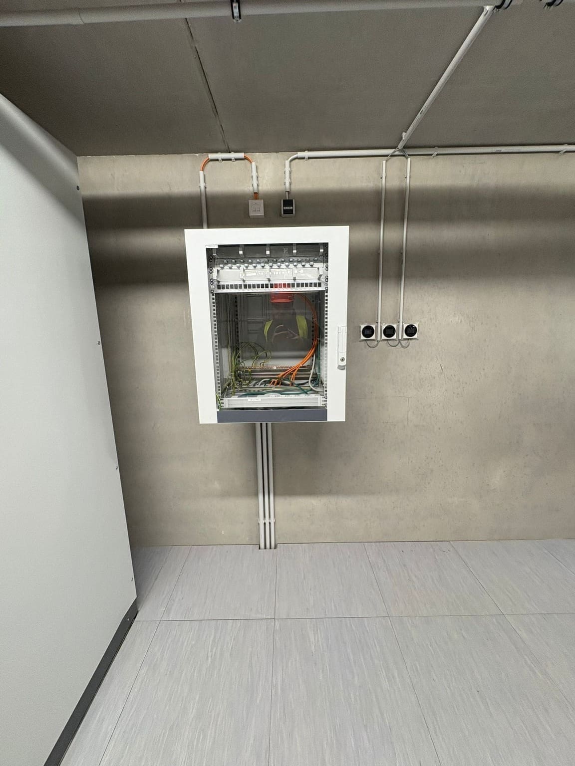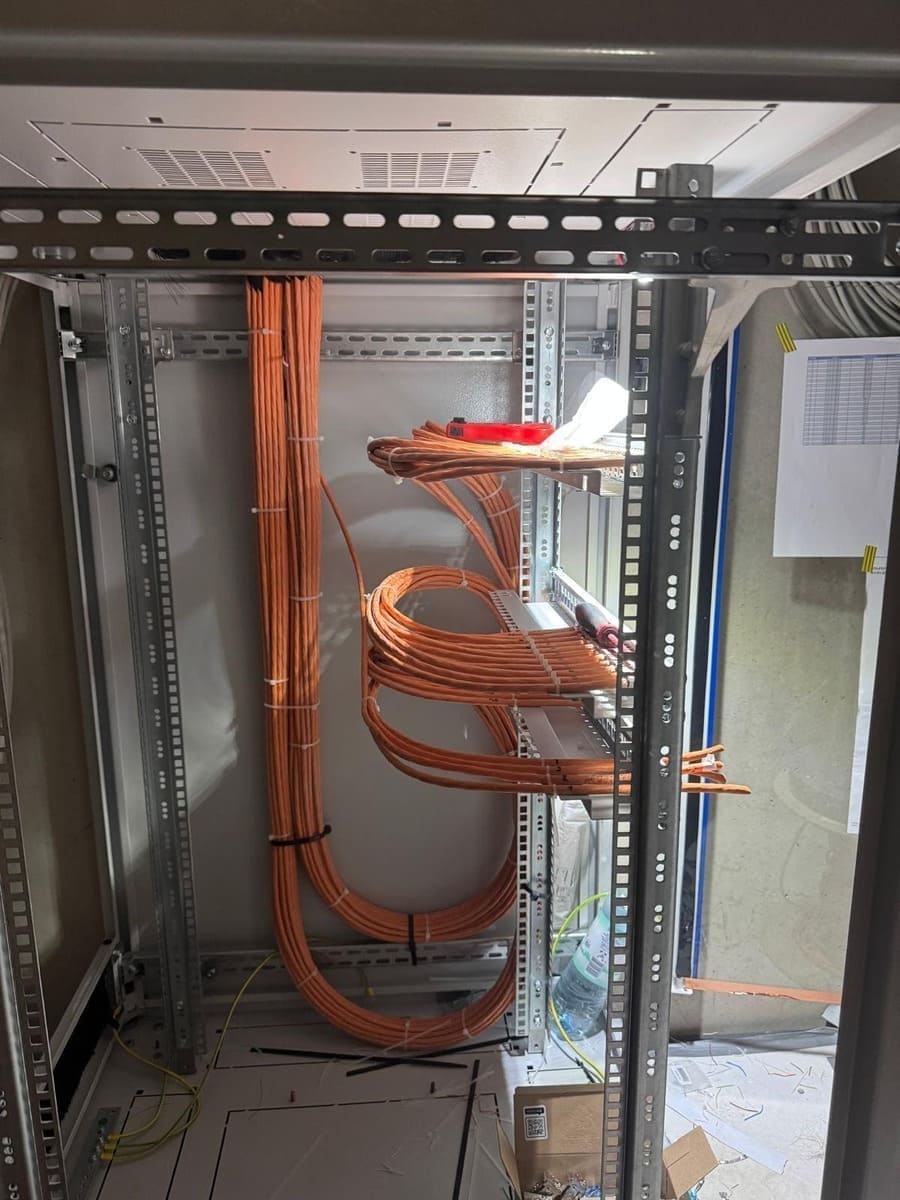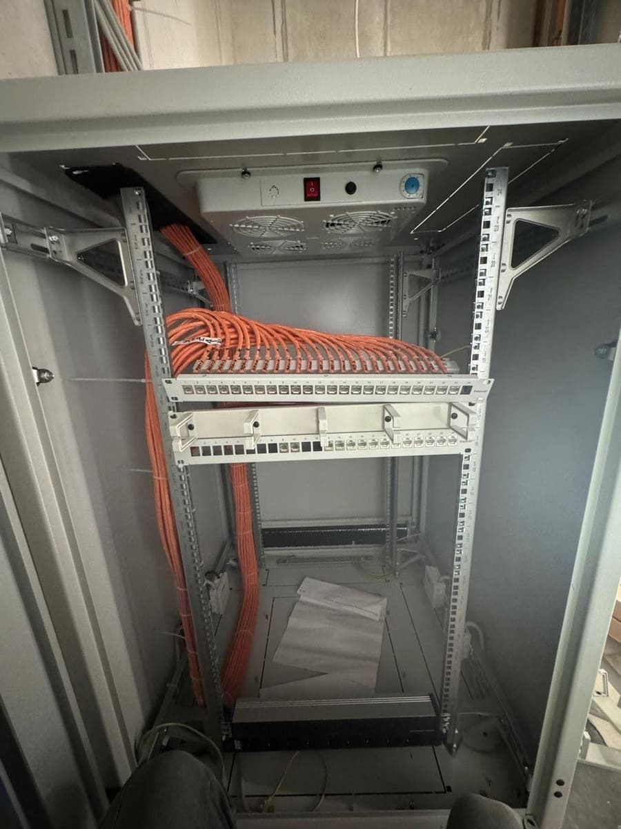 Server and distribution cabinets were installed, including cable routes and cable fixings. CAT7 internet cables were routed and neatly organized inside the cabinets and along the cable pathways. Patch panels, servers, and network equipment were connected with structured cable management. The works ensure reliability, easy maintenance, and proper operation of the IT infrastructure.